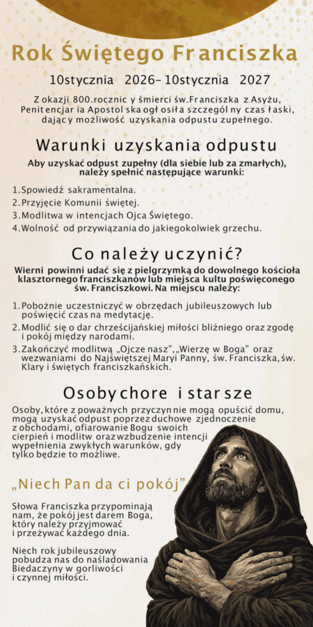 Pragniemy poinformować, że obecnie obchodzimy rok św. Franciszka z Asyżu. Ten jubileuszowy czas łaski rozpoczął się 10 stycznia 2026 i potrwa do 10 stycznia 2027.